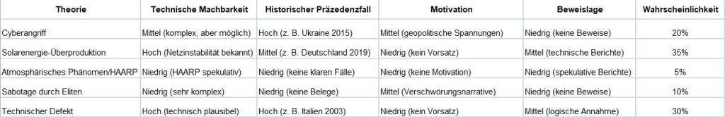 Das wahrscheinlichste Szenario aus der Perspektive alternativer Medien und Verschwörungskanäle ist eine Kombination aus technischen Problemen, insbesondere durch Überproduktion von Solarenergie (35%) oder einen technischen Defekt (30%).